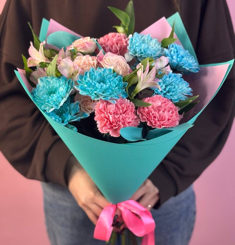 Авторские букеты из серии "Летний бриз" отличаются красивыми переходами двух цветов: бирюзовыми оттенками, напоминающими океан и розовыми, символизирующими тот самый летний закат!