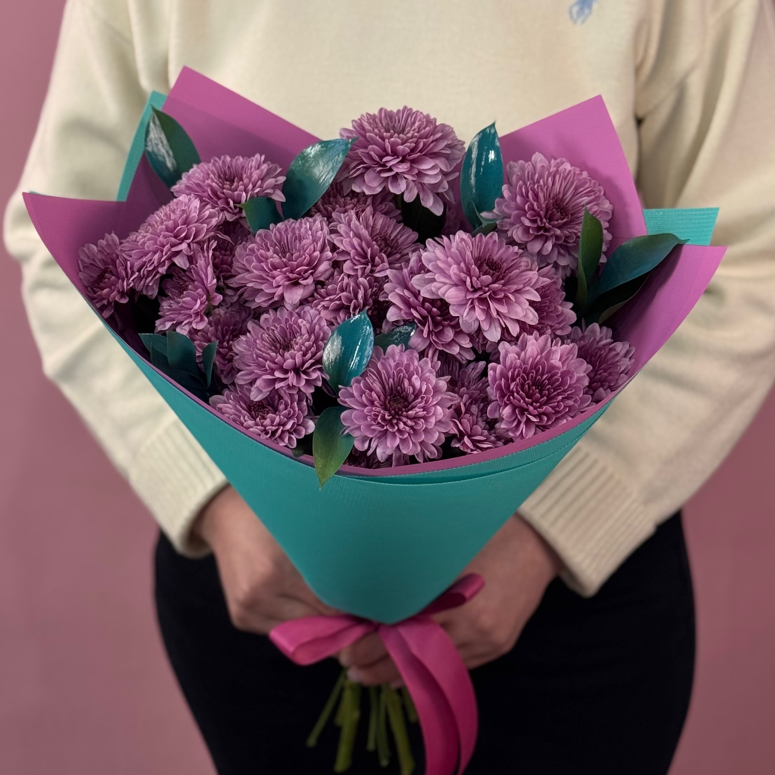 Состав: кустовые хризантемы, крашеная букетная зелень.