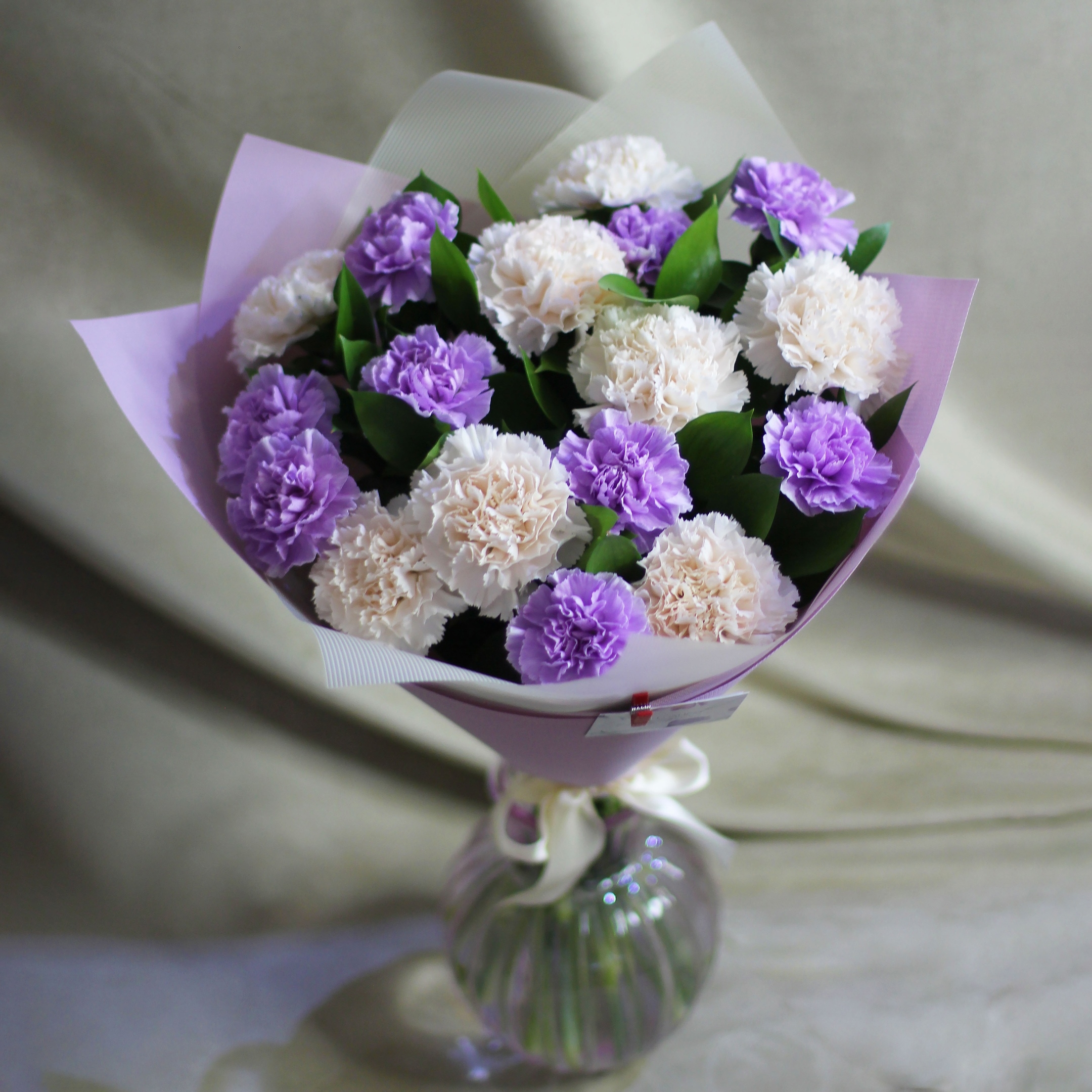 Состав: 17 гвоздик, зелень, упаковка с лентой.