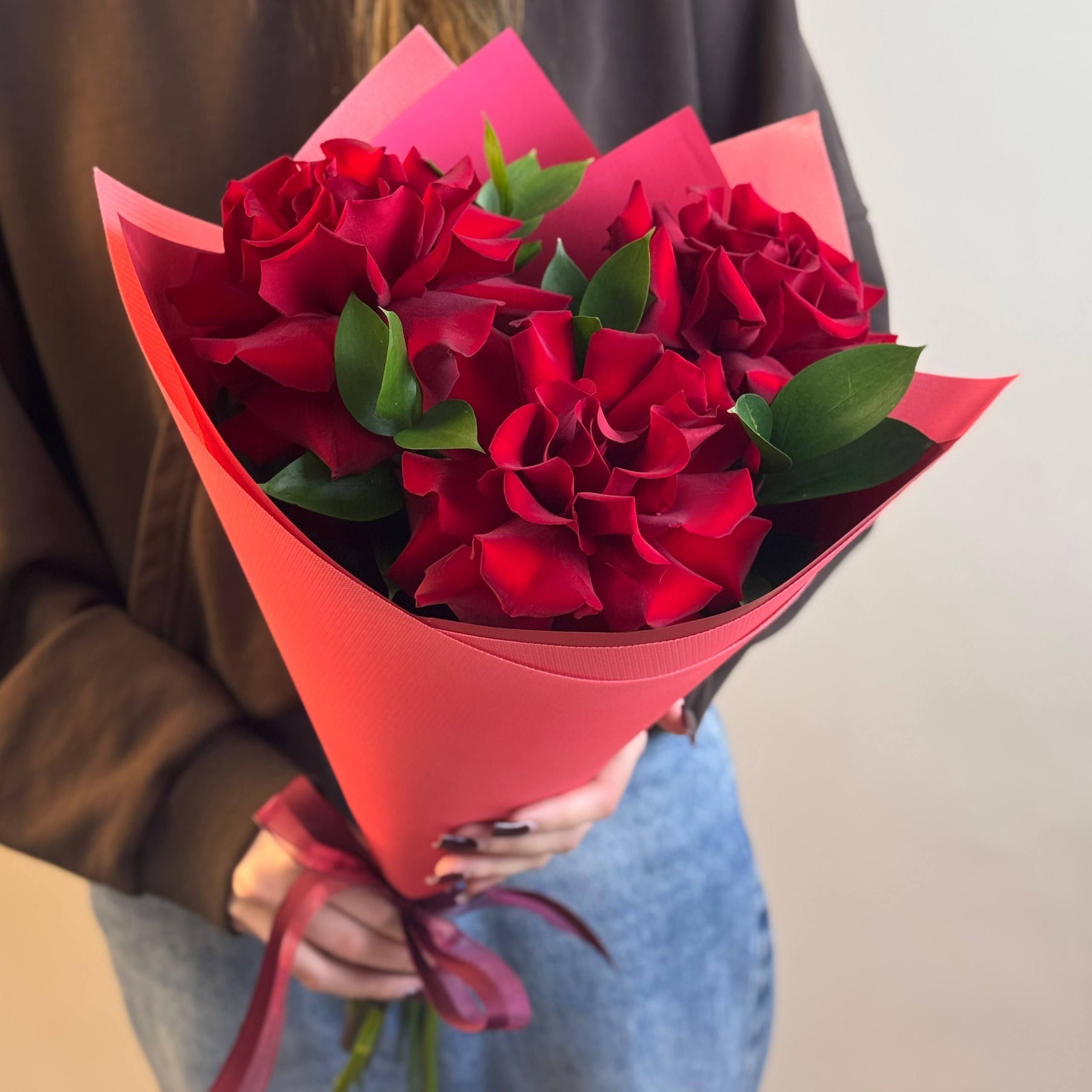 Букет из 3 красных французских роз с зеленью в упаковке №1