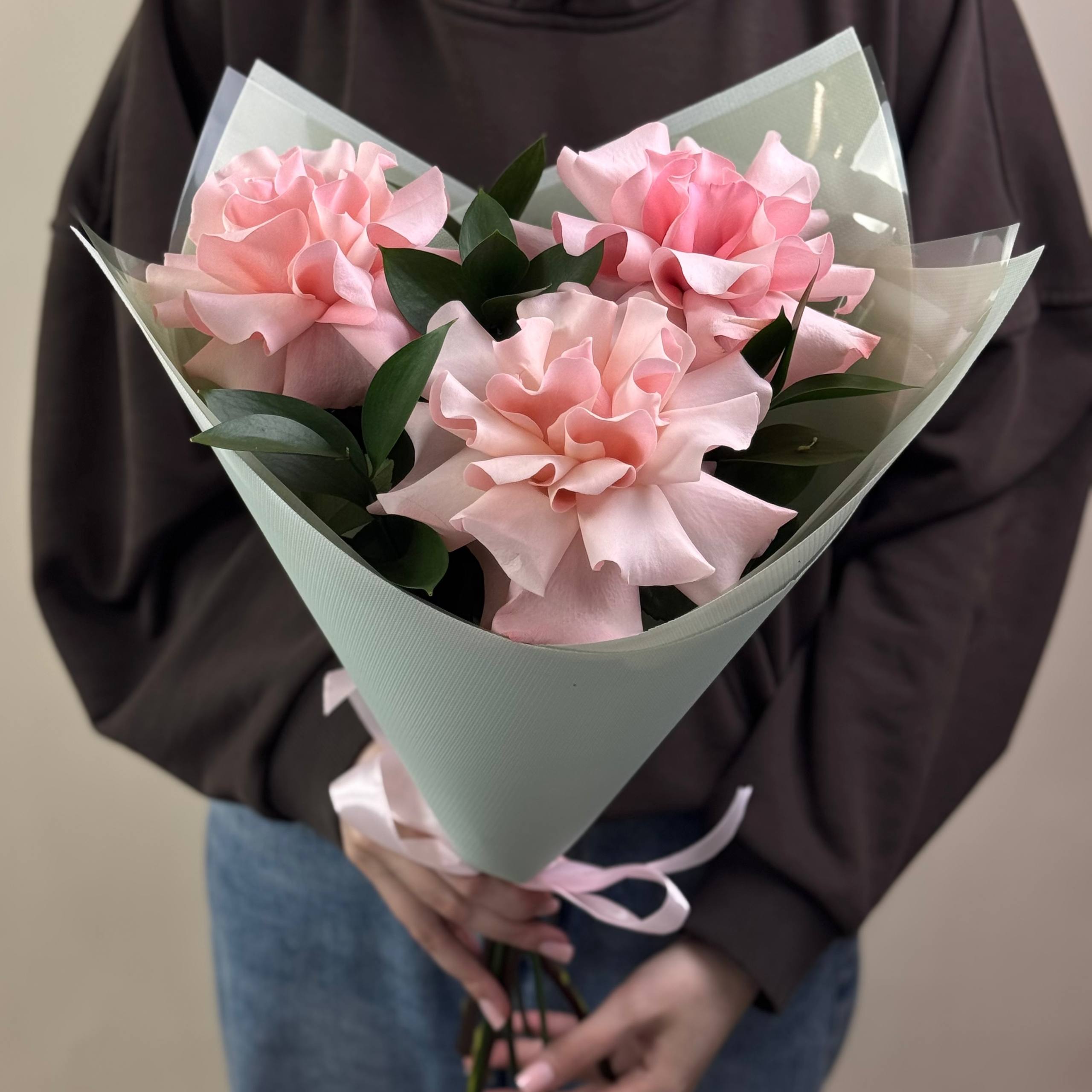 Состав: 3 французские розы, зелень, упаковка с лентой.