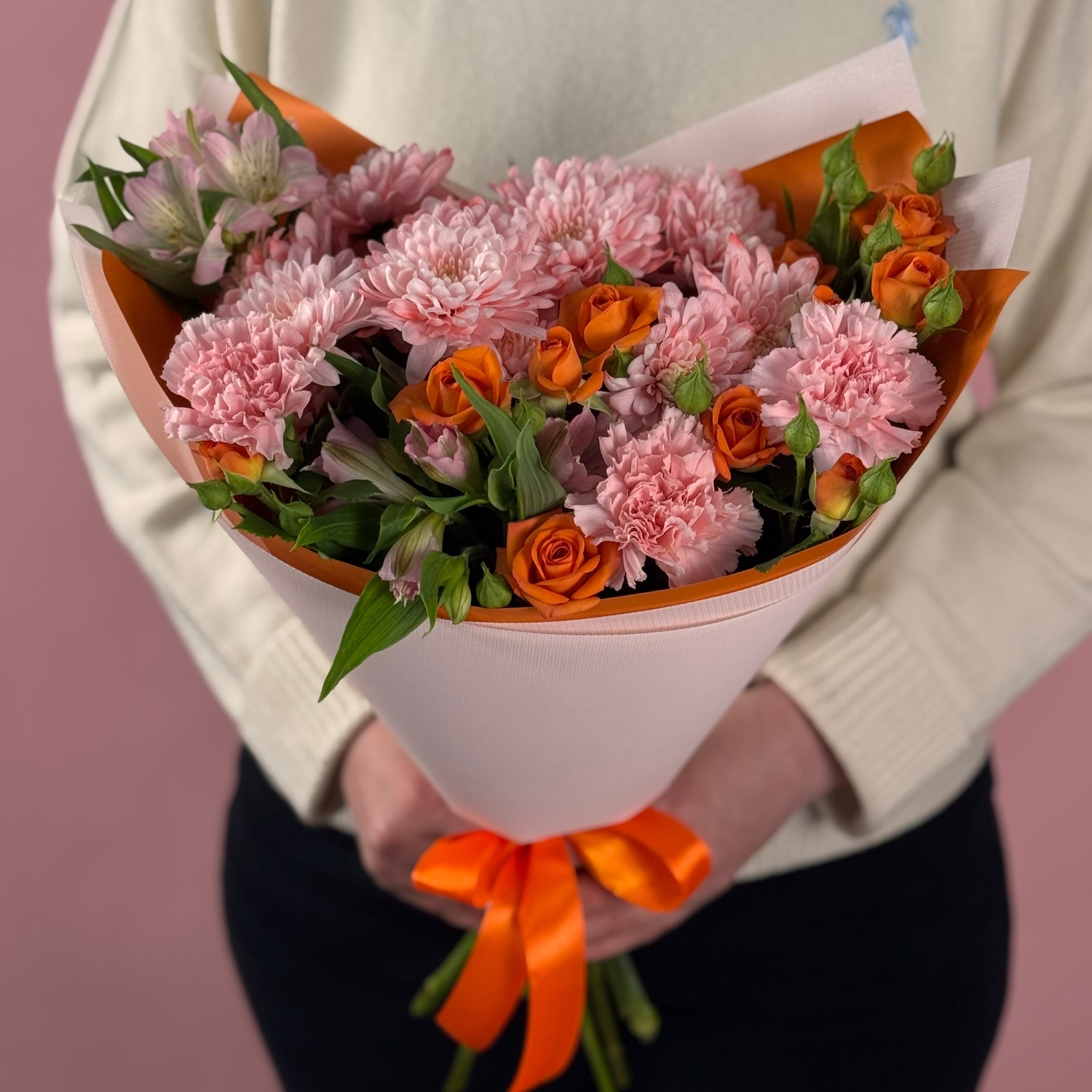 Состав: кустовые хризантемы, кустовые розы, альстромерии, гвоздики.