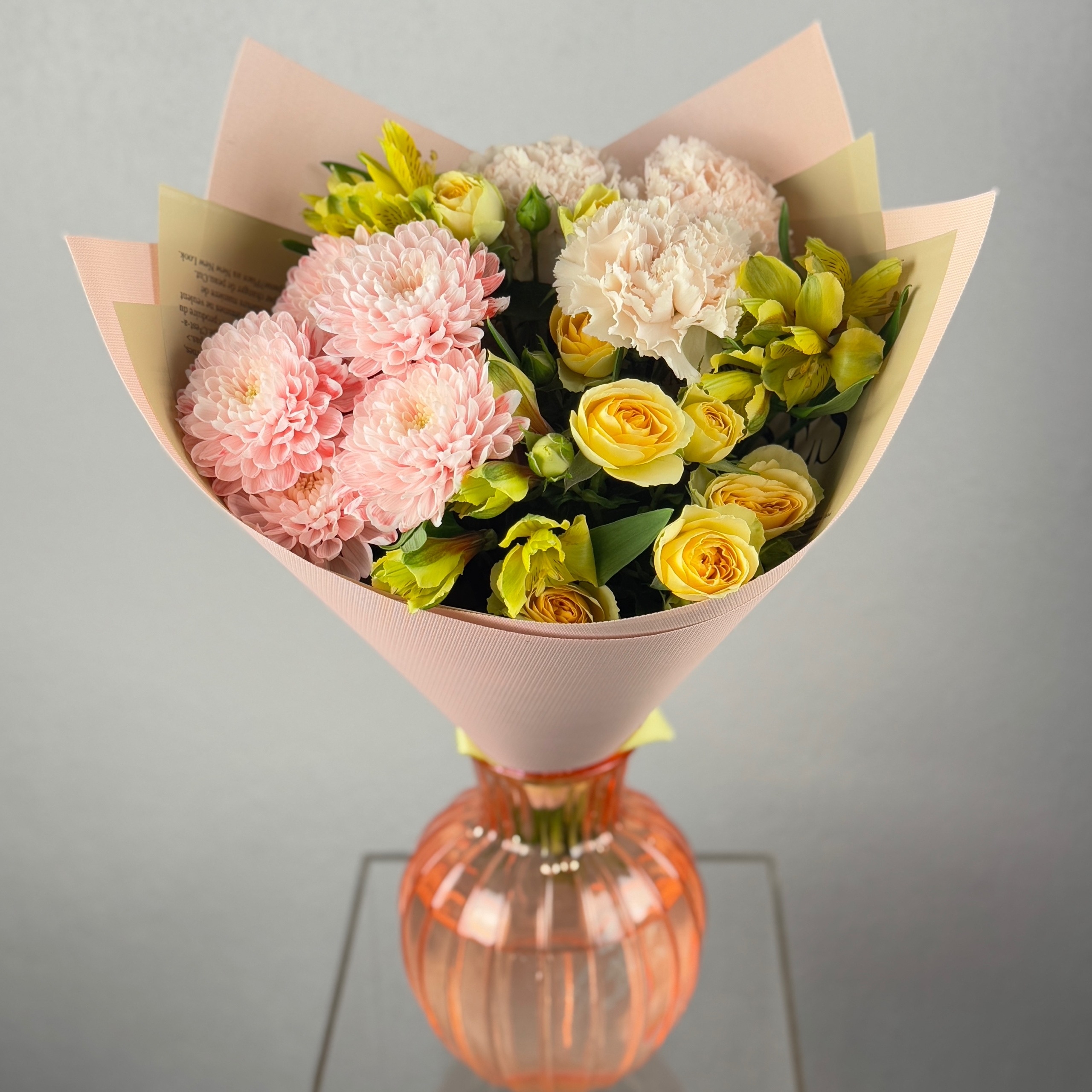 Состав: альстромерии, розы кустовые, хризантемы кустовые, гвоздики.