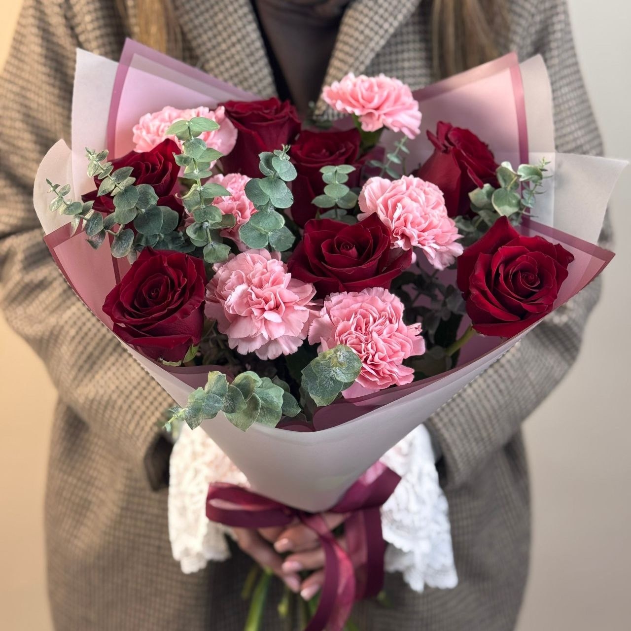 Обращаем внимание! Мы сохраним настроение и цветовую гамму, но 100% повторение невозможно. Сорт, оттенок цветов, вид декоративной зелени и декор  может отличаться от представленного на фото.