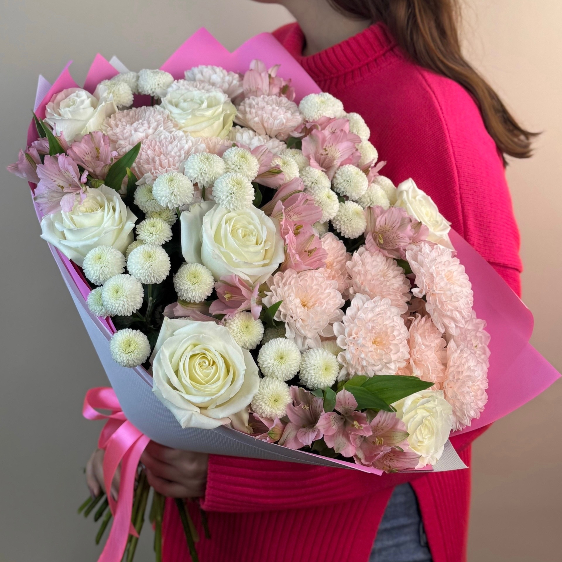 Состав: розы, кустовые хризантемы разных сортов, альстромерия, букетная зелень.