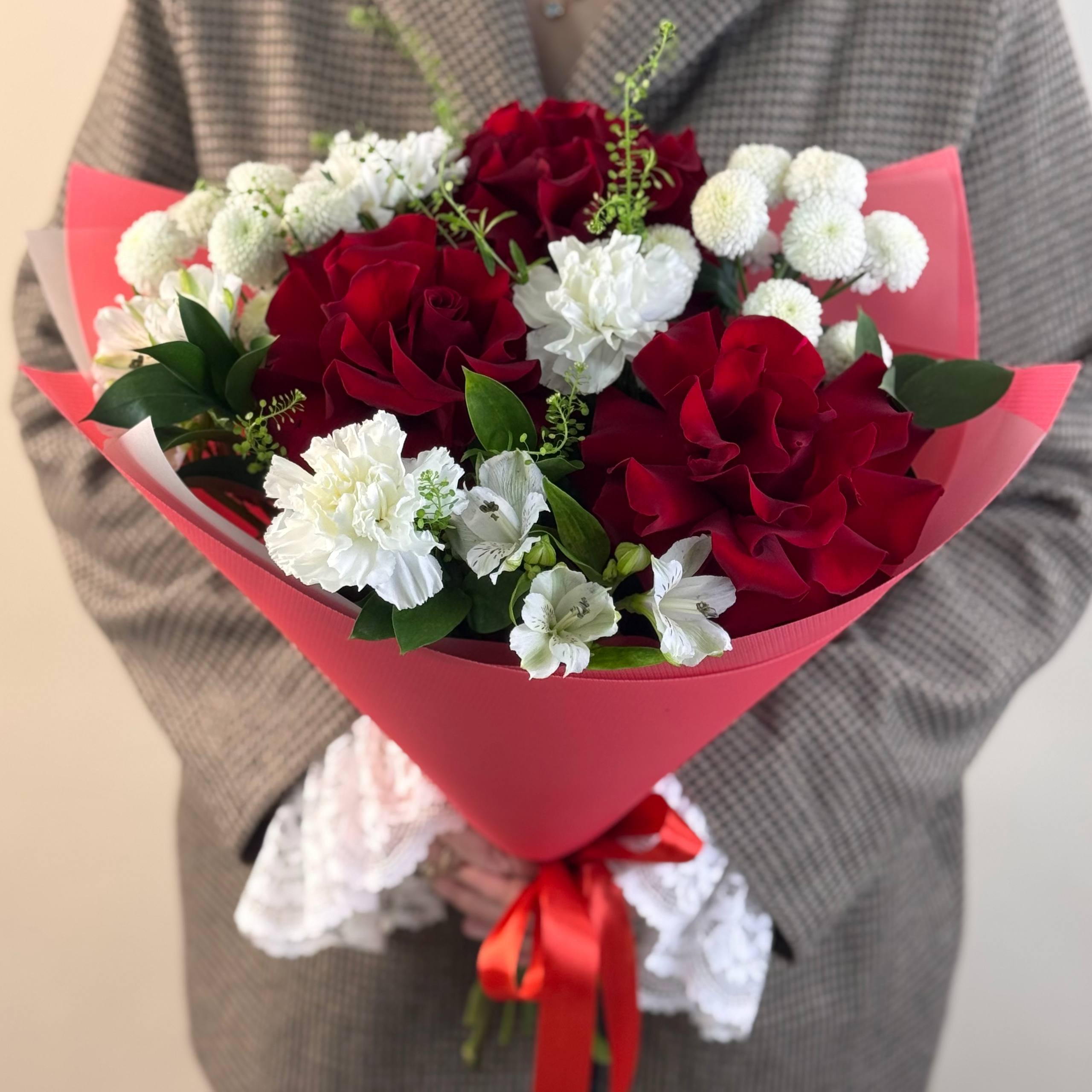 Состав: французские розы, альстромерии, кустовые хризантемы, гвоздики, букетный декор и зелень.