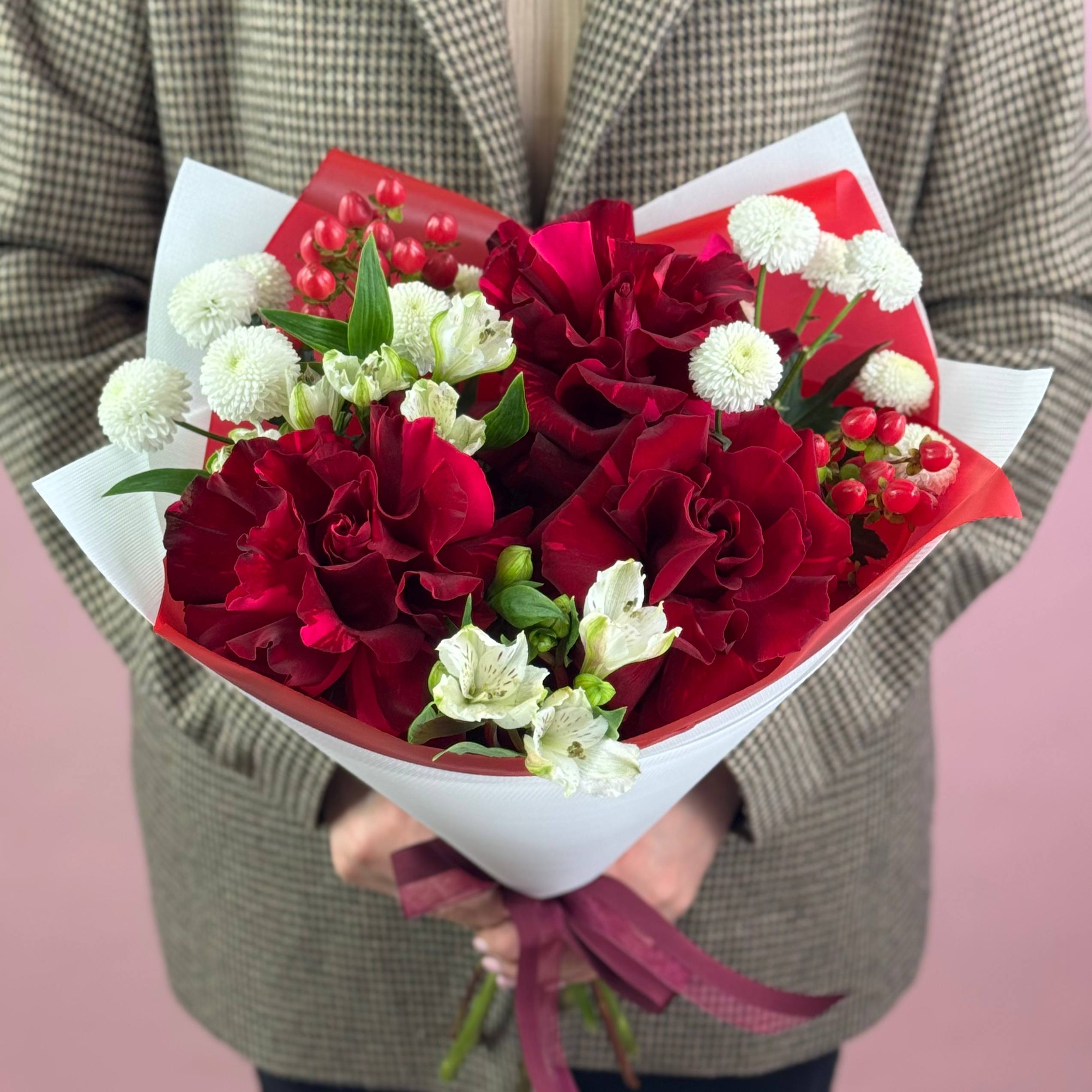 Авторские букеты из серии «Русский стиль» — диалог белого и красного: классика с современным характером.