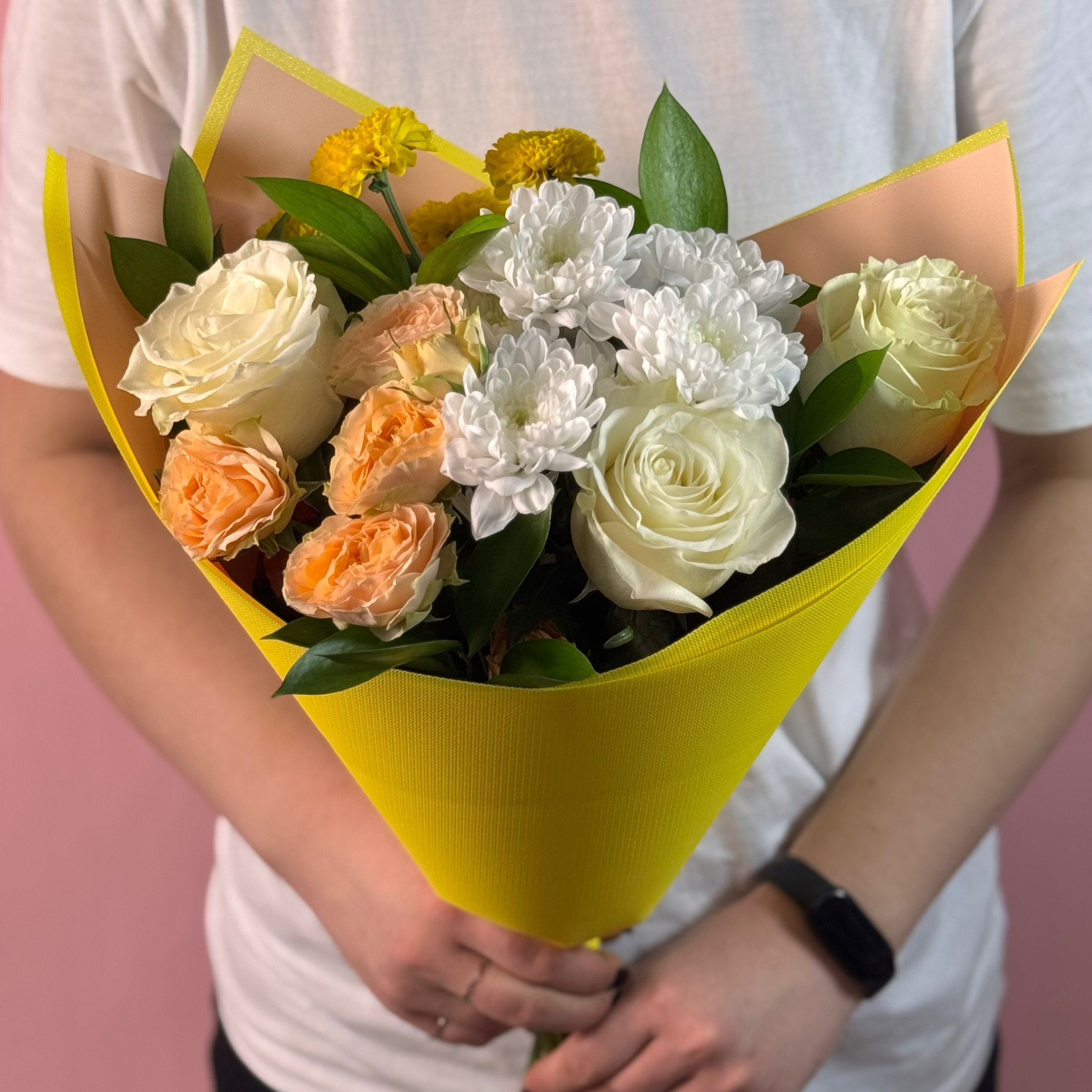 100% повторение чаще всего невозможно. Поэтому оставляем за собой право изменить с сохранением цветовой гаммы упаковку и декор, не в ущерб красоте букета!