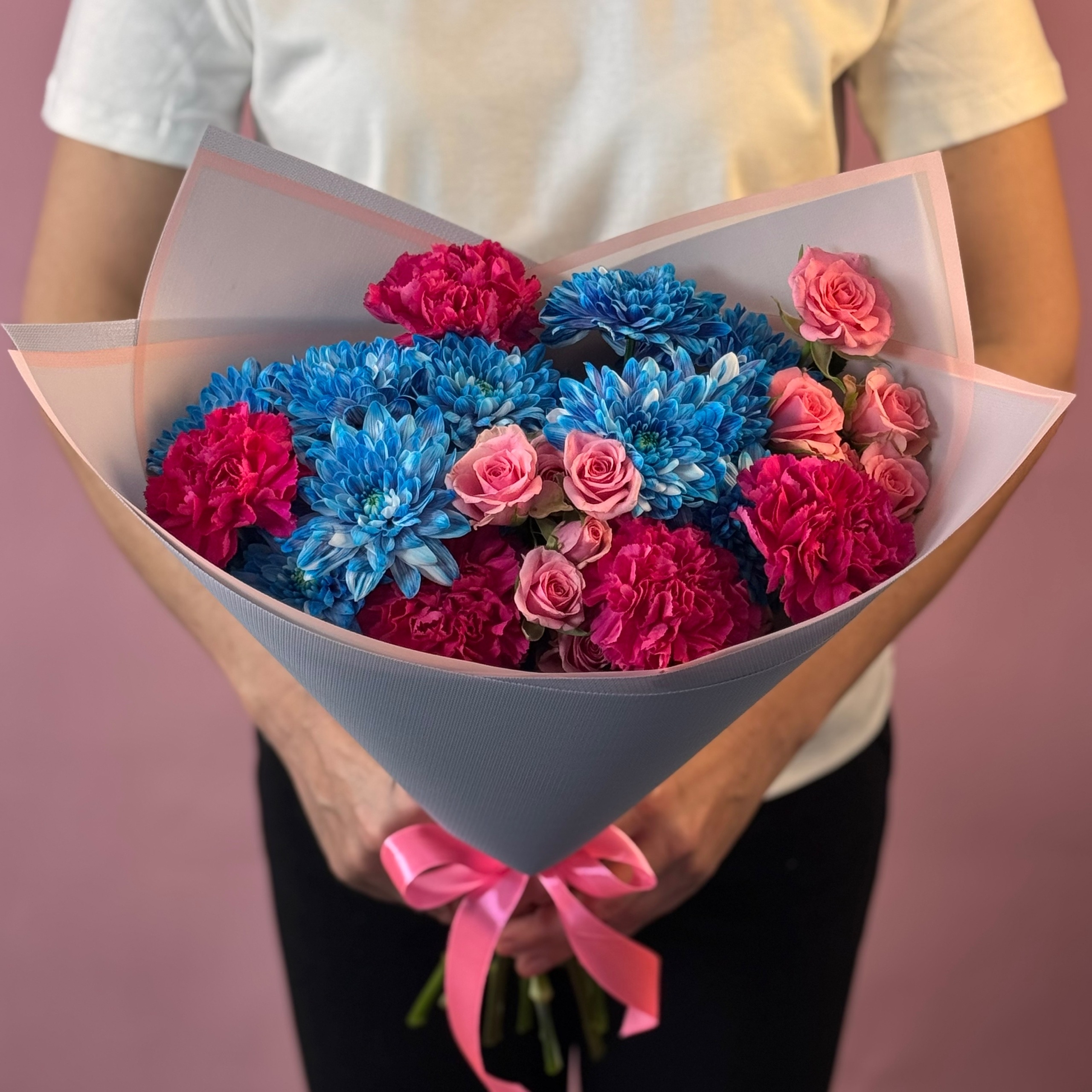 Обращаем внимание! Мы сохраним настроение и цветовую гамму, но 100% повторение невозможно. Сорт, оттенок цветов, упаковки, вид декоративной зелени и декор может отличаться от представленного на фото.