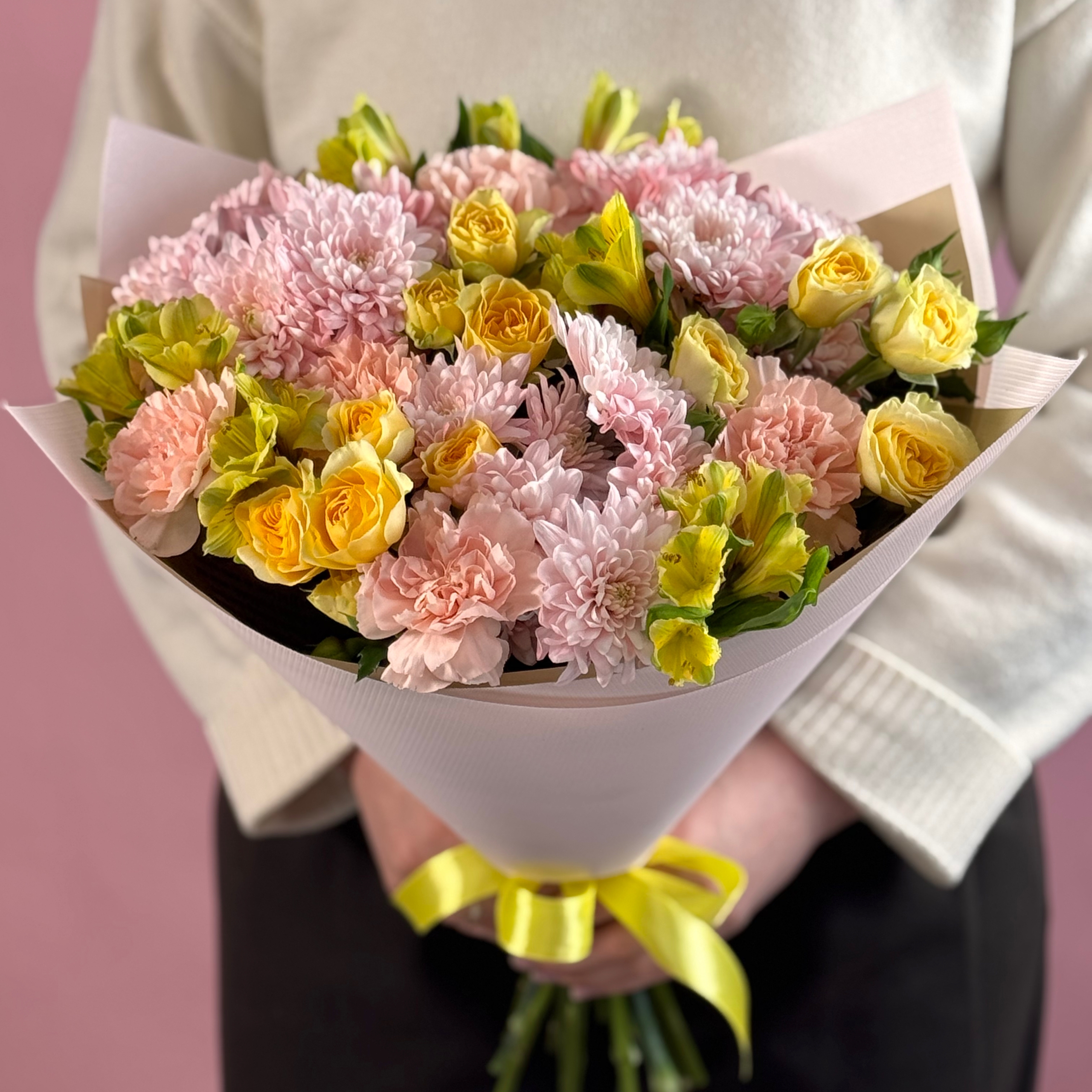 Состав: кустовые хризантемы, кустовые розы, альстромерии, гвоздики.