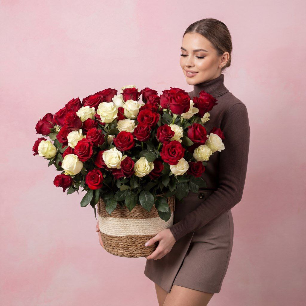 Обращаем внимание! Мы сохраним настроение и цветовую гамму, но 100% повторение невозможно. Сорт, оттенок роз, вид декоративной зелени и внешний вид корзинки может отличаться от представленного на фото.