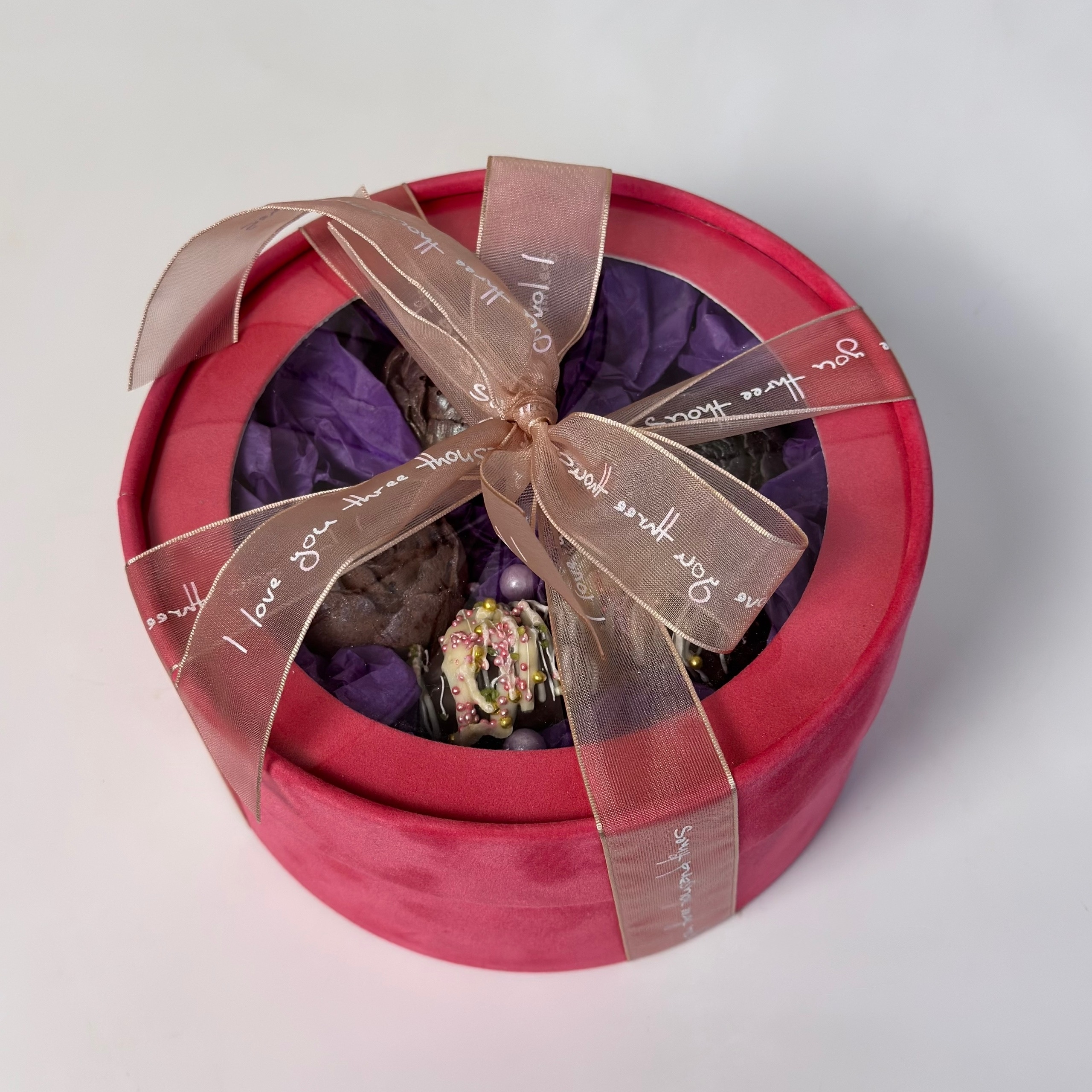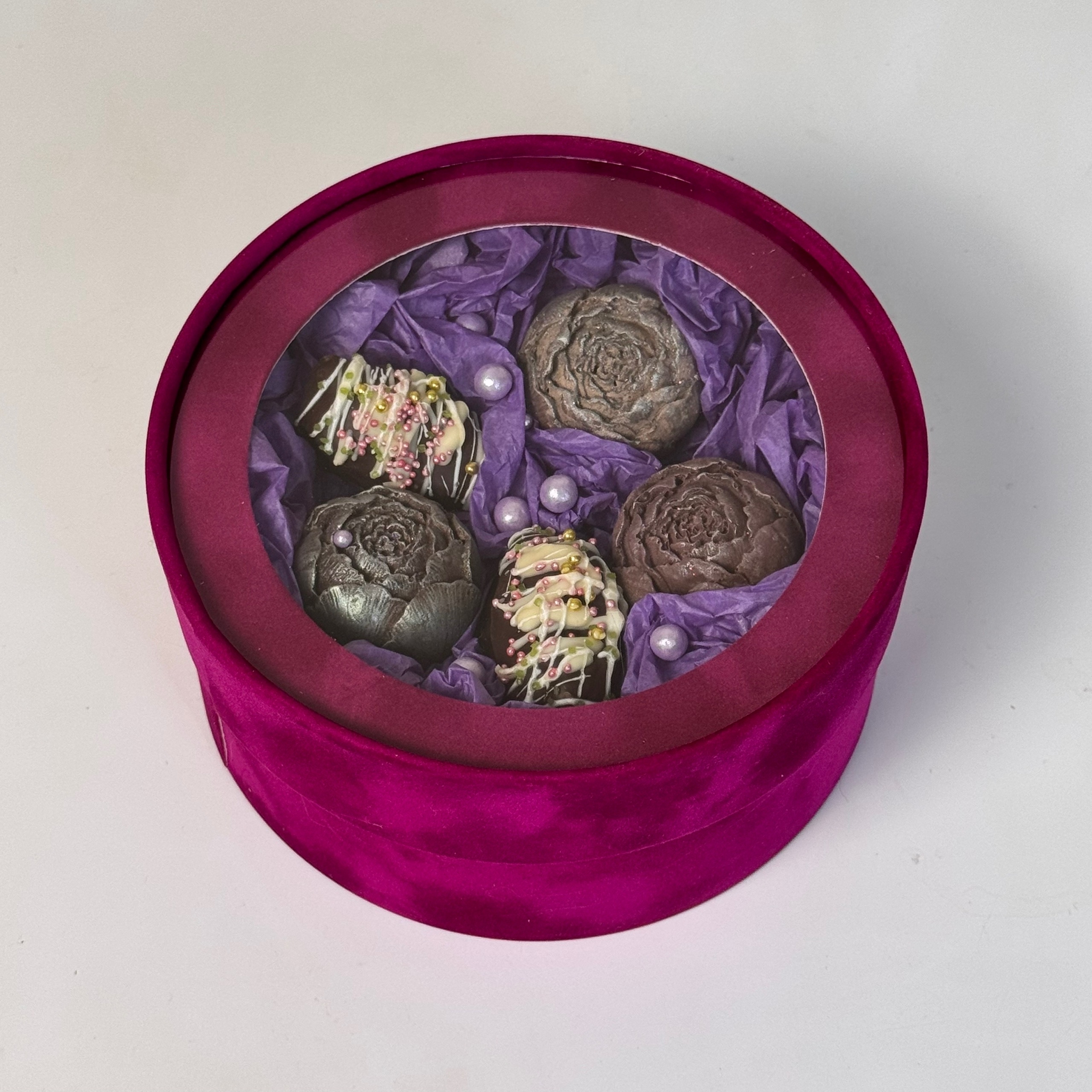 Этот бокс объединяет сразу два десерта: королевские финики в молочном шоколаде с грецким орехом и шоколадные пионы из молочного шоколада. Вкус получается глубоким, насыщенным и очень уютным: мягкая сладость фиников и нежный шоколад хорошо дополняют друг друга. Такой набор подойдёт для подарка, праздничного комплимента или красивого чаепития. Декор делает бокс особенно нарядным и эффектным. Важно учитывать, что сахарные бусины в декоре достаточно твёрдые.
